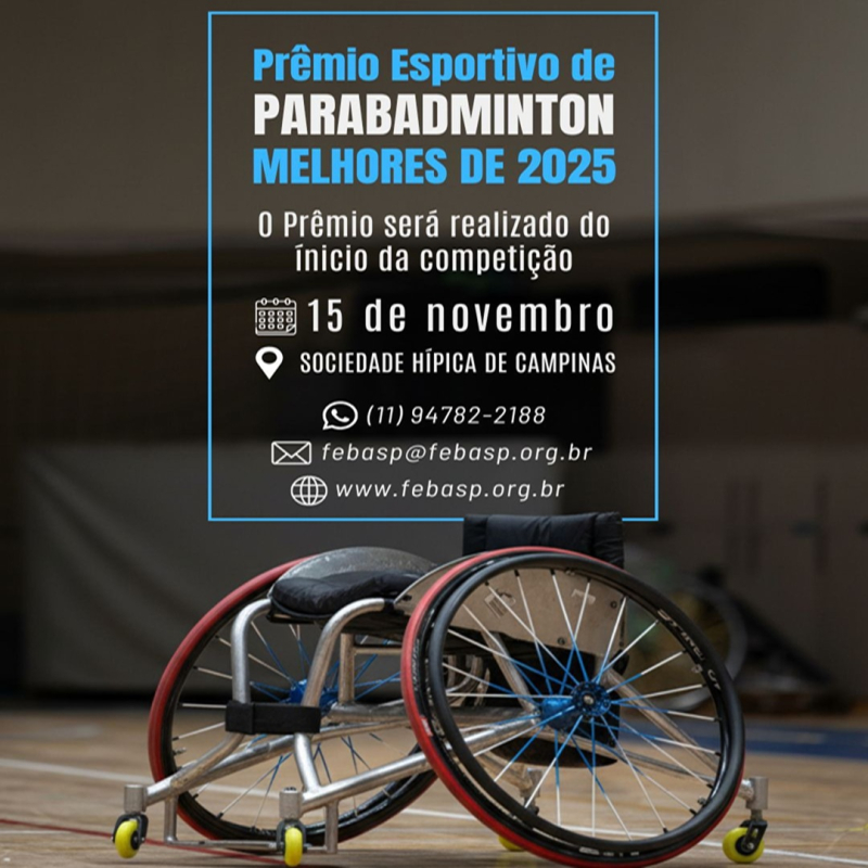A FEBASP conforme anunciado realizará na 5ª Etapa Estadual de Badminton Aberto e Jovens e 3ª Etapa Estadual de Parabadminton no dia 15 de novembro antes do início da competição no Ginásio 1 (Ginásio antigo) o Prêmio Esportivo de Parabadminton 2025 - Melhores de 2024.